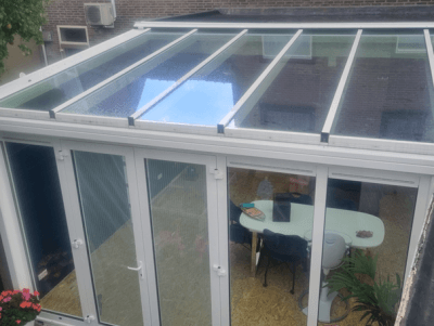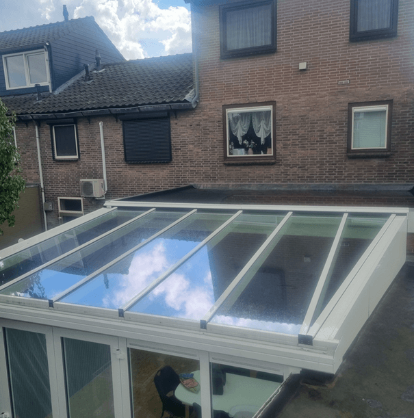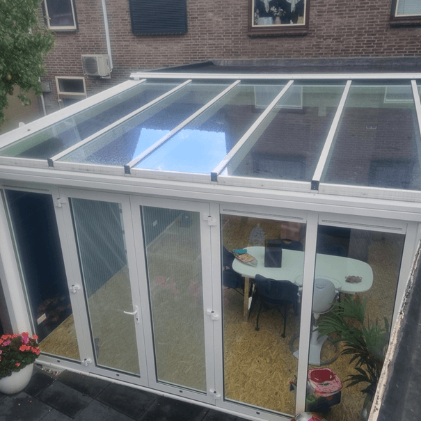 ERDO Serre heeft in Pernis een aluminium serre gerealiseerd die mooi aansluit op de bestaande woning. De serre is uitgevoerd met witte profielen en een glazen dak dat ruim daglicht binnenlaat.